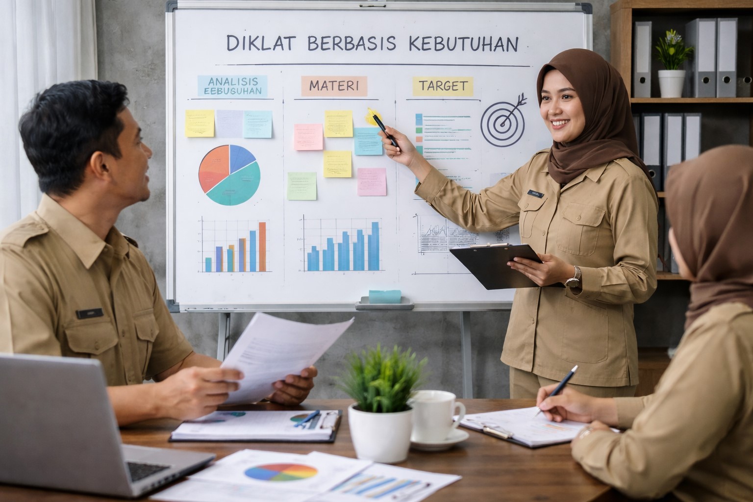 Identifikasi kebutuhan merupakan tahap krusial dalam diklat berbasis kebutuhan nyata. Proses ini dimulai dengan pengumpulan informasi dari berbagai sumber, seperti laporan kinerja, hasil evaluasi internal, keluhan pengguna layanan, serta masukan dari pimpinan dan pegawai. Observasi langsung terhadap proses kerja juga menjadi cara efektif untuk melihat hambatan yang sering luput dari laporan tertulis. Selain itu, dialog terbuka dengan pegawai membantu menggali kesulitan yang mereka alami dan kompetensi yang dirasa kurang. Identifikasi kebutuhan tidak harus rumit, namun harus sistematis dan jujur. Kesalahan umum yang perlu dihindari adalah menganggap semua masalah dapat diselesaikan dengan diklat. Beberapa masalah mungkin bersumber dari sistem, kebijakan, atau sarana prasarana. Oleh karena itu, identifikasi kebutuhan juga harus membedakan mana yang memang membutuhkan intervensi pelatihan dan mana yang memerlukan solusi lain.